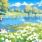 - 山坡,野花,野花,背着弓箭的少女,飞鸟,唯美手绘插画壁纸图片