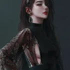 - 穿着黑色吊带睡裙的黑发性感美女手绘插画壁纸美图